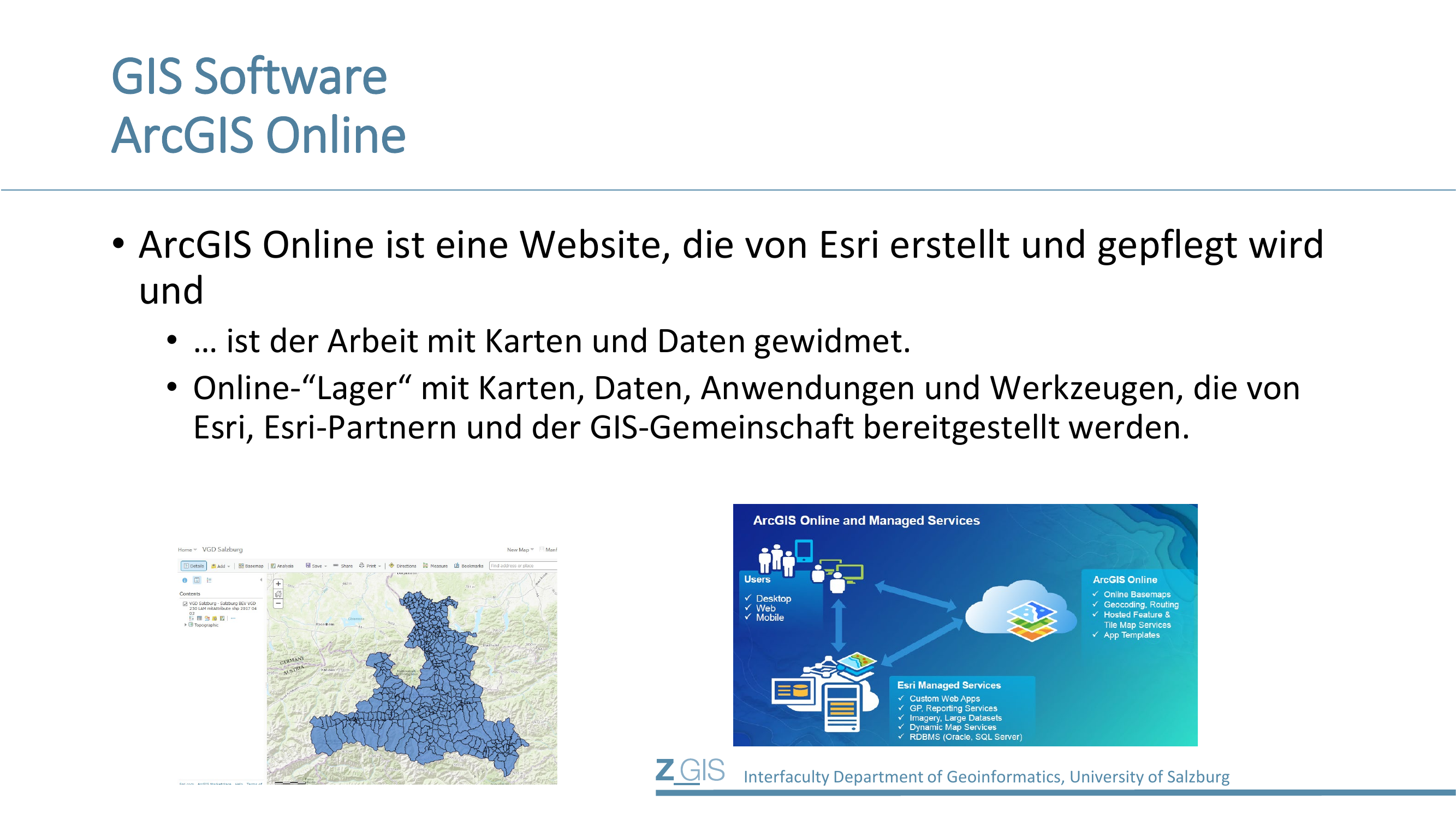 ArcGIS Online ist eine von Esri erstellte und gepflegte Website, die der Arbeit mit Karten und Daten gewidmet ist. Es fungiert als Online-"Lager" mit Karten, Daten, Anwendungen und Werkzeugen, die von Esri, Esri-Partnern und der GIS-Gemeinschaft bereitgestellt werden. Auf Slide 24 sieht man links eine Kartenansicht der VGD (Verwaltungsgrenzen) Salzburg in ArcGIS Online und rechts ein Architekturdiagramm, das die Beziehung zwischen Users (Desktop, Web, Mobile), ArcGIS Online (Online Basemaps, Geocoding, Routing, Hosted Feature & Tile Map Services, App Templates) und Esri Managed Services (Custom Web Apps, GP/Reporting Services, Imagery, Large Datasets, Dynamic Map Services, RDBMS) zeigt.