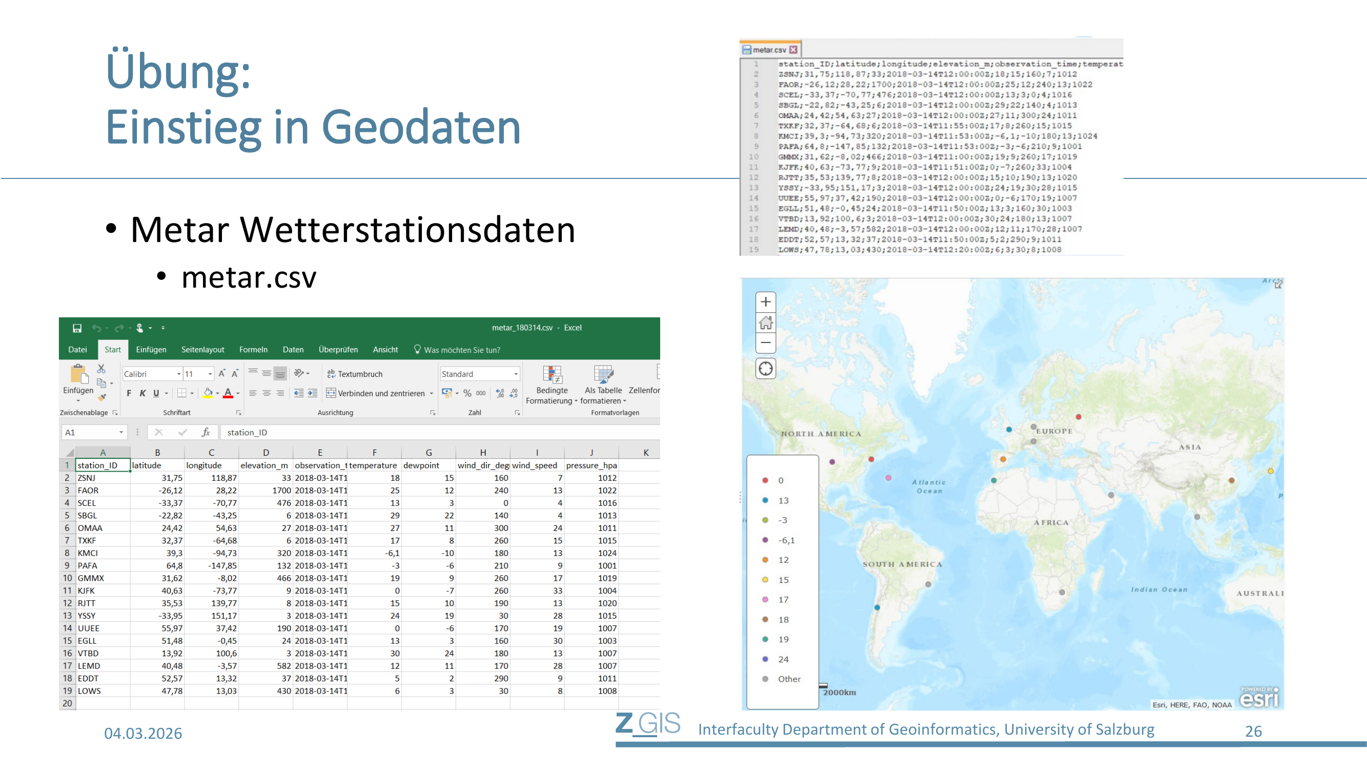 Als erste Datenquelle dienen METAR-Wetterstationsdaten (Meteorological Aerodrome Report) im CSV-Format (metar.csv). Auf Slide 26 sieht man links die Datei in Excel geöffnet: Jede Zeile repräsentiert eine Wetterstation mit Attributen wie station_ID, latitude, longitude, elevation_m, observation_time, temperature, dewpoint, wind_dir_deg, wind_speed und pressure_hpa. Rechts oben sieht man denselben Datensatz als Rohtext (semikolongetrennt) und rechts unten die resultierende Kartenvisualisierung in ArcGIS Online, bei der die Stationen weltweit als farbcodierte Punkte nach Temperatur dargestellt werden.