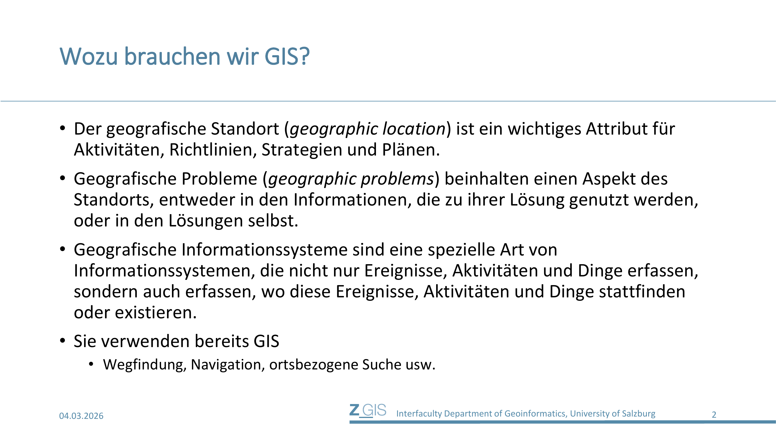 Geografische Probleme (Geographic Problems) beinhalten stets einen Aspekt des Standorts. Entweder steckt dieser Aspekt in den Informationen, die zur Lösung herangezogen werden, oder er steckt in den Lösungen selbst. GIS sind dabei eine spezielle Art von Informationssystemen, die nicht nur Ereignisse, Aktivitäten und Dinge erfassen, sondern auch festhalten, wo diese Ereignisse, Aktivitäten und Dinge stattfinden oder existieren. Tatsächlich verwenden wir im Alltag bereits GIS-basierte Anwendungen, ohne darüber nachzudenken - Wegfindung, Navigation und ortsbezogene Suche sind alltägliche Beispiele.