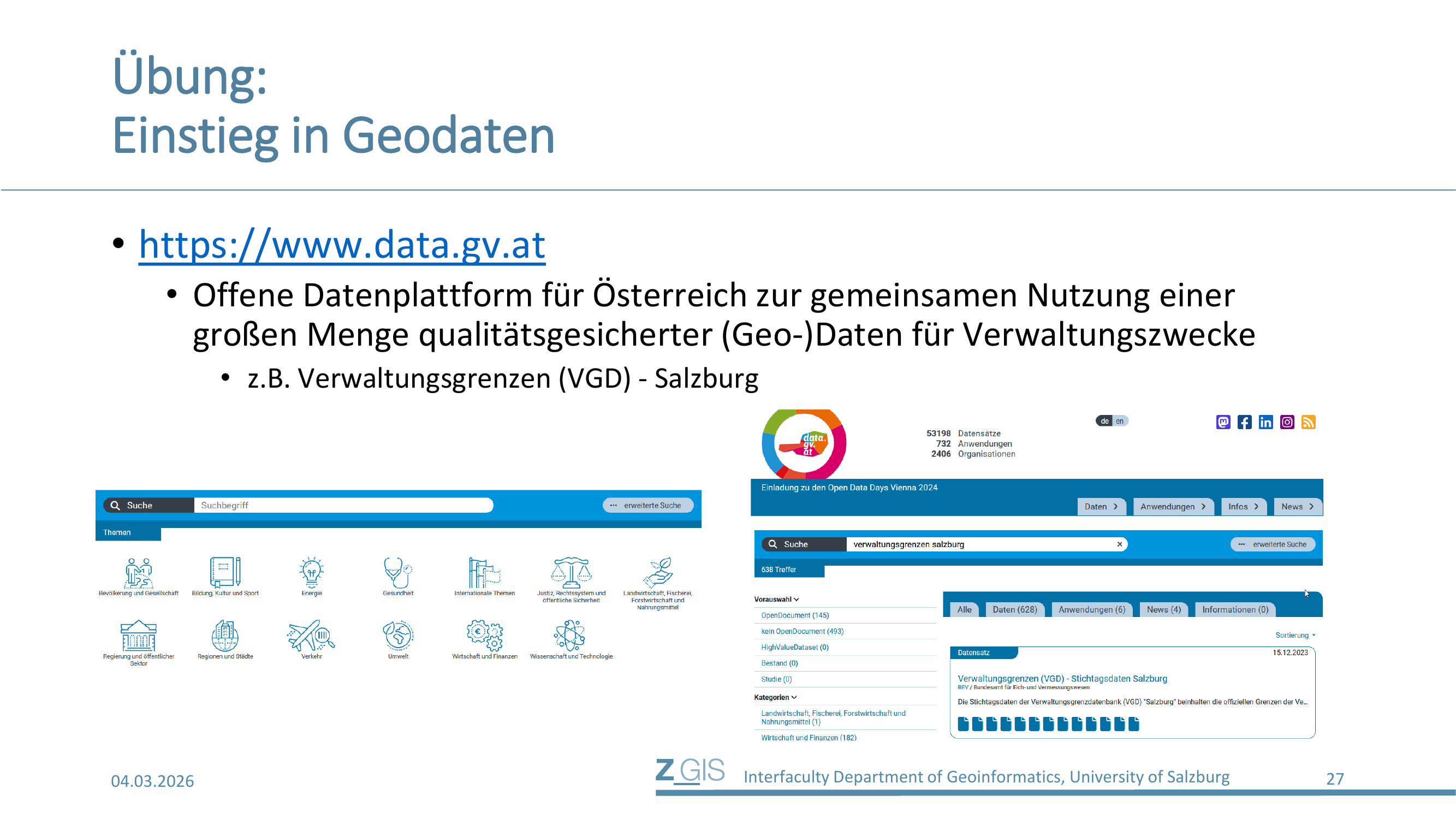 Die zweite Datenquelle ist data.gv.at, die offene Datenplattform für Österreich. Hier werden qualitätsgesicherte Geodaten für Verwaltungszwecke zur gemeinsamen Nutzung bereitgestellt. Für die Übung werden die Verwaltungsgrenzen (VGD) des Bundeslandes Salzburg heruntergeladen. Auf Slide 27 sieht man die Suchoberfläche von data.gv.at mit dem Suchbegriff "verwaltungsgrenzen salzburg".