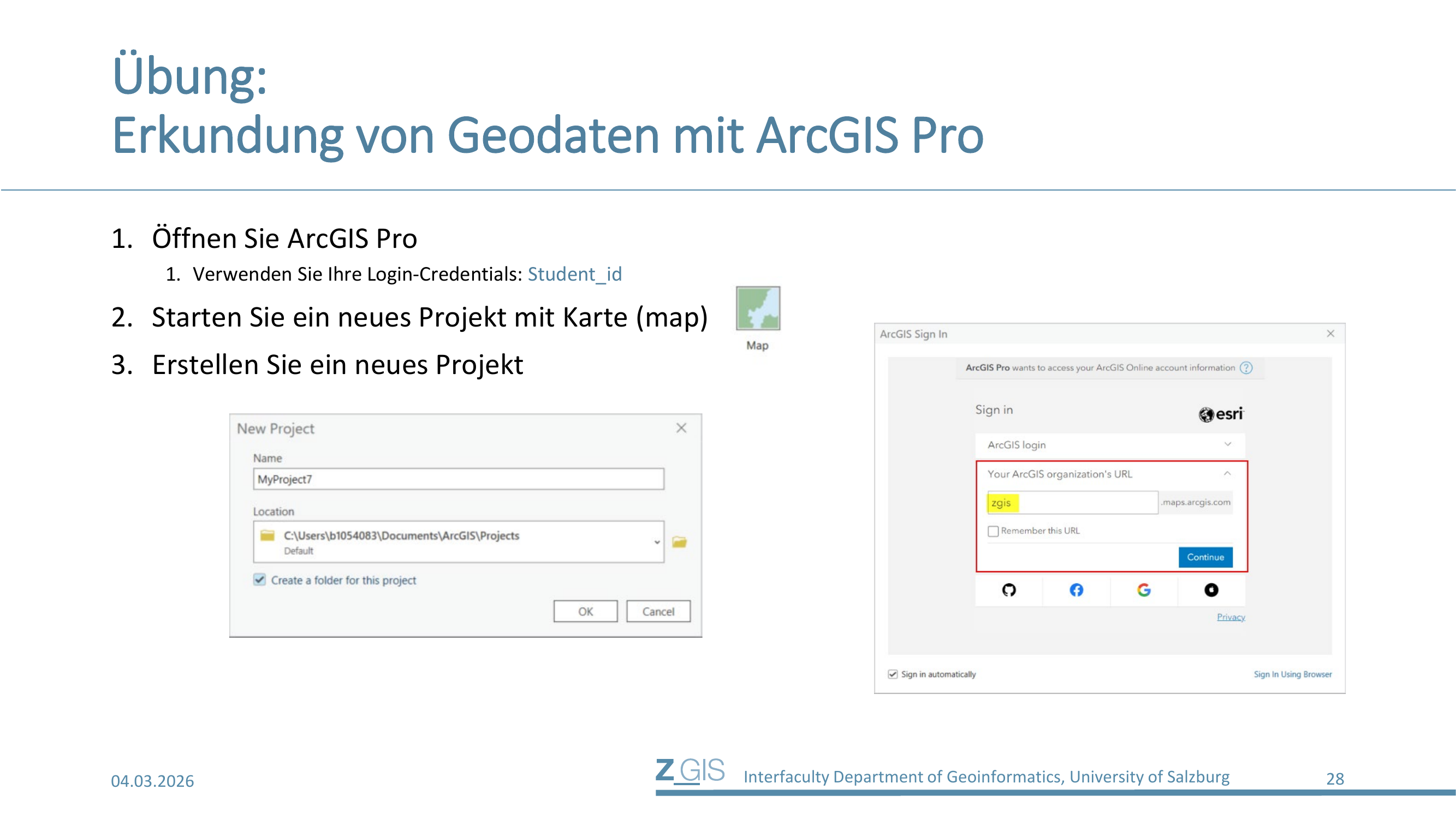 Der Einstieg in ArcGIS Pro beginnt mit dem Öffnen der Anwendung und der Anmeldung über die ArcGIS-Organisation (zgis.maps.arcgis.com). Man erstellt ein neues Projekt mit einer Karte (Map) und gibt dem Projekt einen Namen und einen Speicherort.