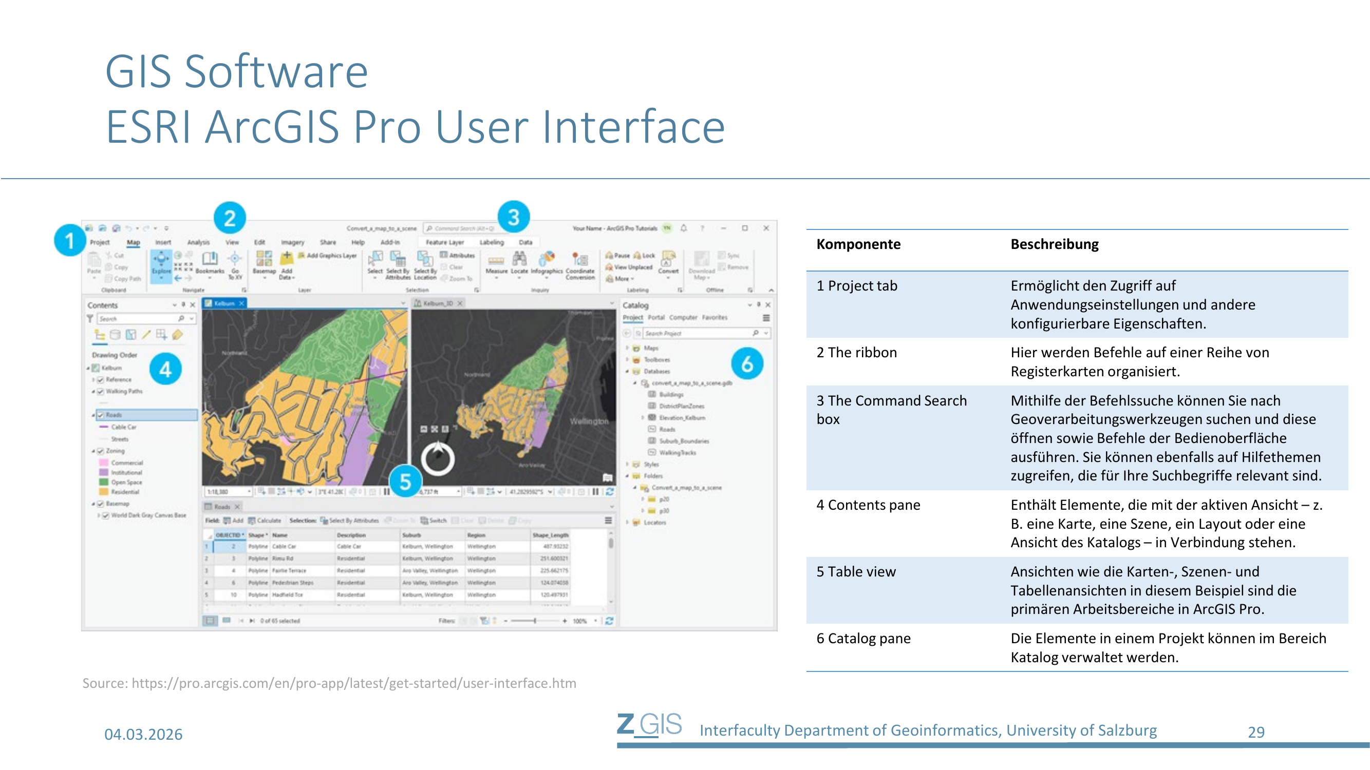 Die Benutzeroberfläche von ArcGIS Pro besteht aus sechs zentralen Komponenten, die auf Slide 29 nummeriert dargestellt sind: