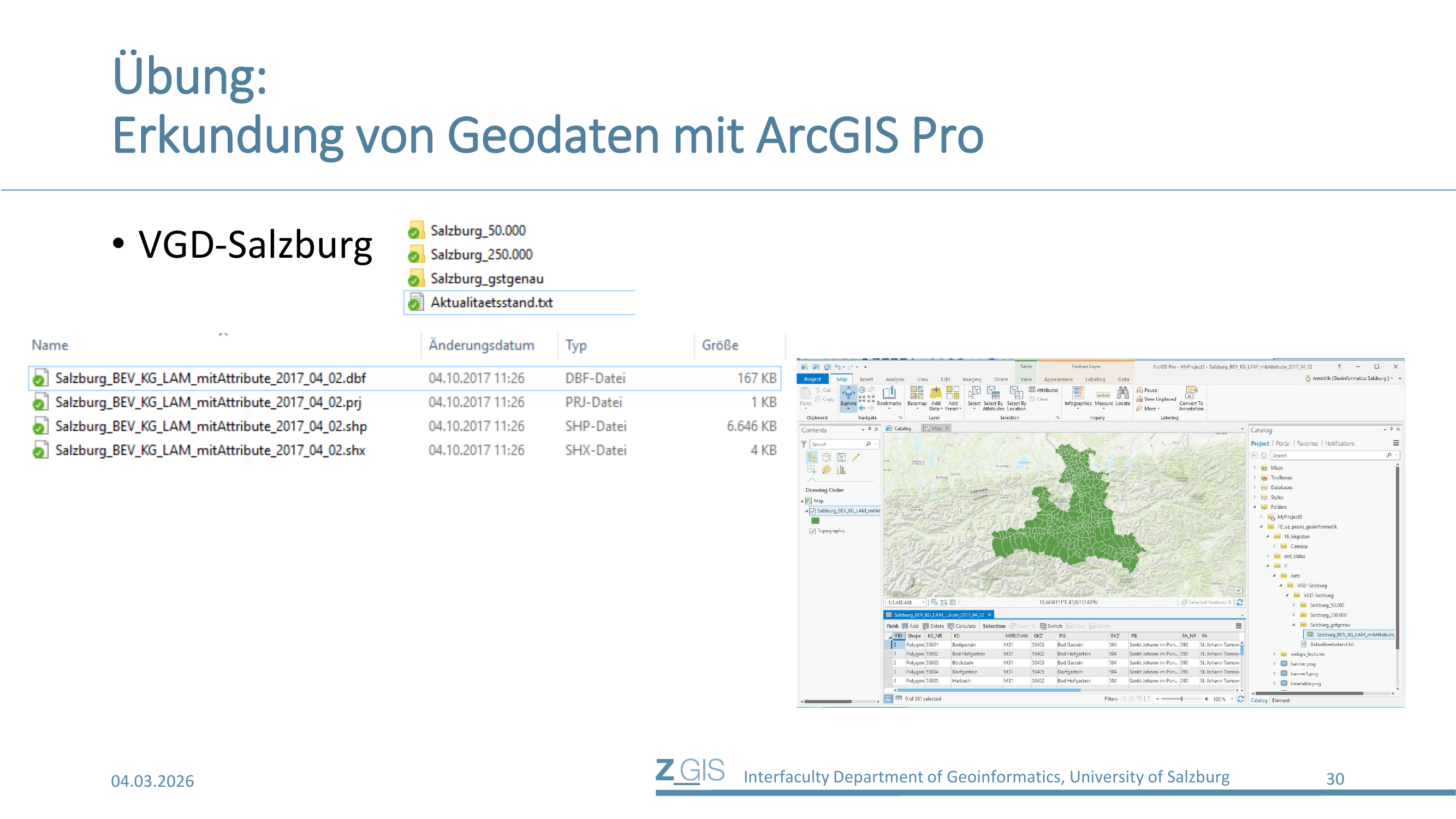 Alle vier Dateien müssen im selben Verzeichnis liegen und denselben Dateinamen tragen, damit das Shapefile korrekt gelesen werden kann. Rechts auf Slide 30 sieht man das Ergebnis: Die Gemeindegrenzen des Bundeslandes Salzburg, dargestellt in ArcGIS Pro mit einer Attributtabelle, die Informationen wie KG_NR, KG (Katastralgemeinde), MERIDIAN, GKZ (Gemeindekennzahl), PG (Politische Gemeinde), BKZ und PB (Politischer Bezirk) enthält.