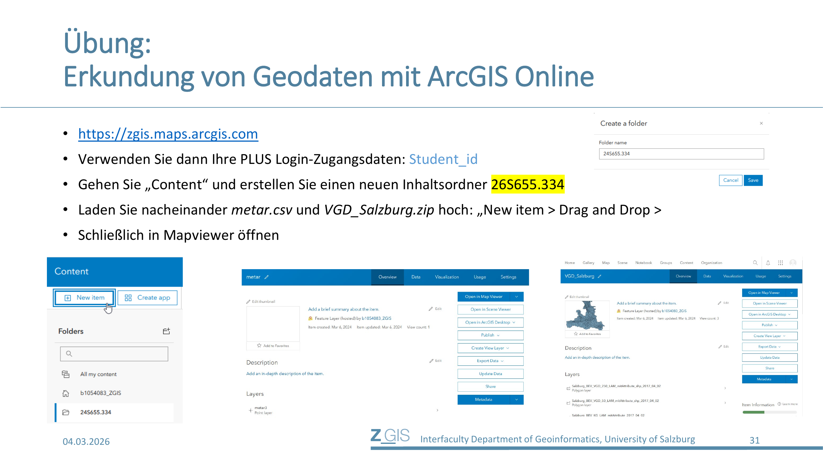 Über das Portal zgis.maps.arcgis.com können Daten auch in ArcGIS Online hochgeladen und erkundet werden. Dazu erstellt man im Bereich "Content" einen neuen Inhaltsordner, lädt die Dateien metar.csv und VGD_Salzburg.zip per "New Item" und Drag and Drop hoch und öffnet sie anschließend im Map Viewer.