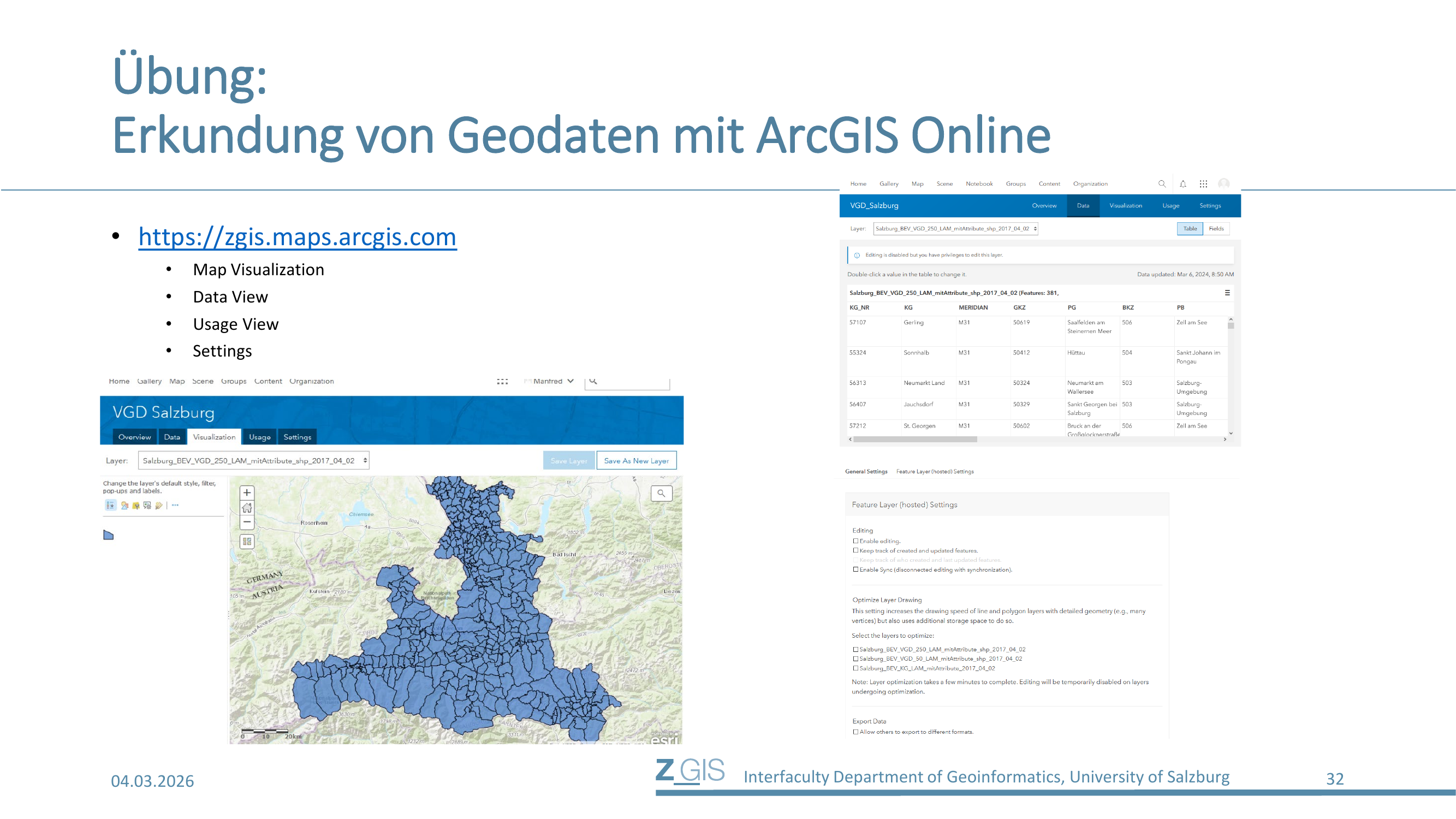 ArcGIS Online bietet für jeden hochgeladenen Datensatz verschiedene Ansichten: Map Visualization (Kartenansicht mit Visualisierungsoptionen), Data View (Tabellenansicht mit den Attributdaten), Usage View (Nutzungsstatistiken) und Settings (Einstellungen wie Editierrechte, Layer-Optimierung und Export-Optionen). Auf Slide 32 sieht man rechts die Data View der VGD Salzburg mit Attributen wie KG_NR, KG, MERIDIAN, GKZ, PG, BKZ und PB.