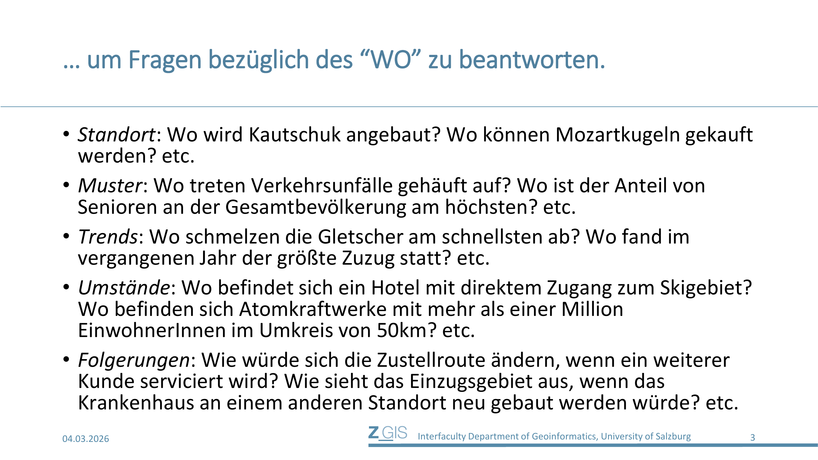 GIS beantworten Fragen bezüglich des "WO". Diese lassen sich in fünf Kategorien einteilen. Erstens Standortfragen: Wo wird Kautschuk angebaut? Wo können Mozartkugeln gekauft werden? Zweitens Musterfragen (Pattern): Wo treten Verkehrsunfälle gehäuft auf? Wo ist der Anteil von Senioren an der Gesamtbevölkerung am höchsten? Drittens Trendfragen (Trends): Wo schmelzen die Gletscher am schnellsten ab? Wo fand im vergangenen Jahr der größte Zuzug statt? Viertens Umstandsfragen (Conditions): Wo befindet sich ein Hotel mit direktem Zugang zum Skigebiet? Wo befinden sich Atomkraftwerke mit mehr als einer Million Einwohnern im Umkreis von 50 km? Und fünftens Folgerungen (Implications): Wie würde sich die Zustellroute ändern, wenn ein weiterer Kunde serviciert wird? Wie sieht das Einzugsgebiet aus, wenn das Krankenhaus an einem anderen Standort neu gebaut werden würde?