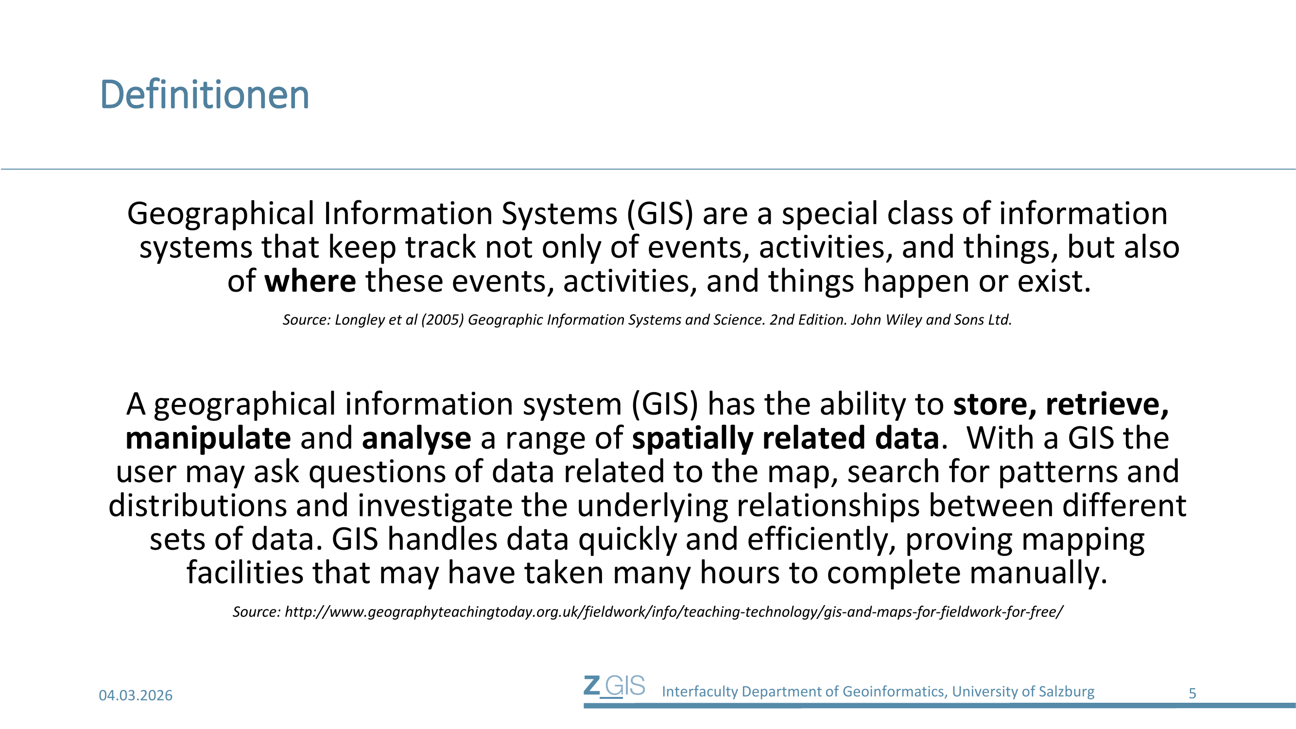 Die formale Definition nach Longley et al. lautet: "Geographical Information Systems (GIS) are a special class of information systems that keep track not only of events, activities, and things, but also of where these events, activities, and things happen or exist." GIS sind also Informationssysteme mit explizitem Raumbezug.