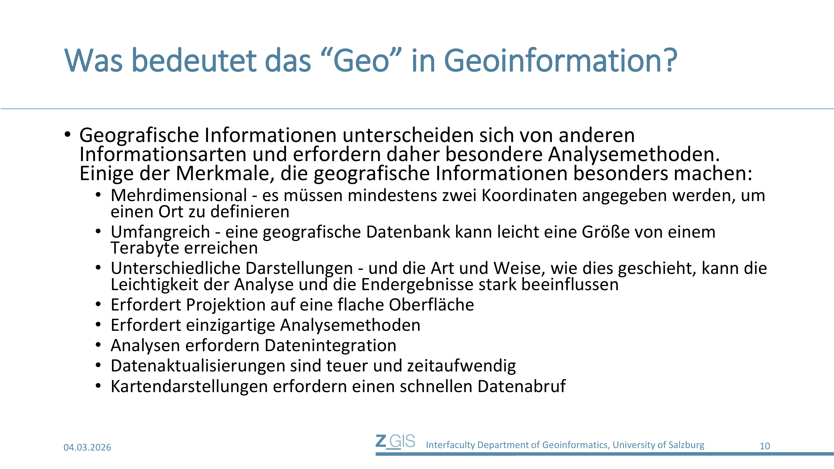 Was macht geografische Informationen eigentlich so besonders? Im Vergleich zu anderen Informationsarten unterscheiden sich Geodaten in mehreren wesentlichen Merkmalen und erfordern daher besondere Analysemethoden.