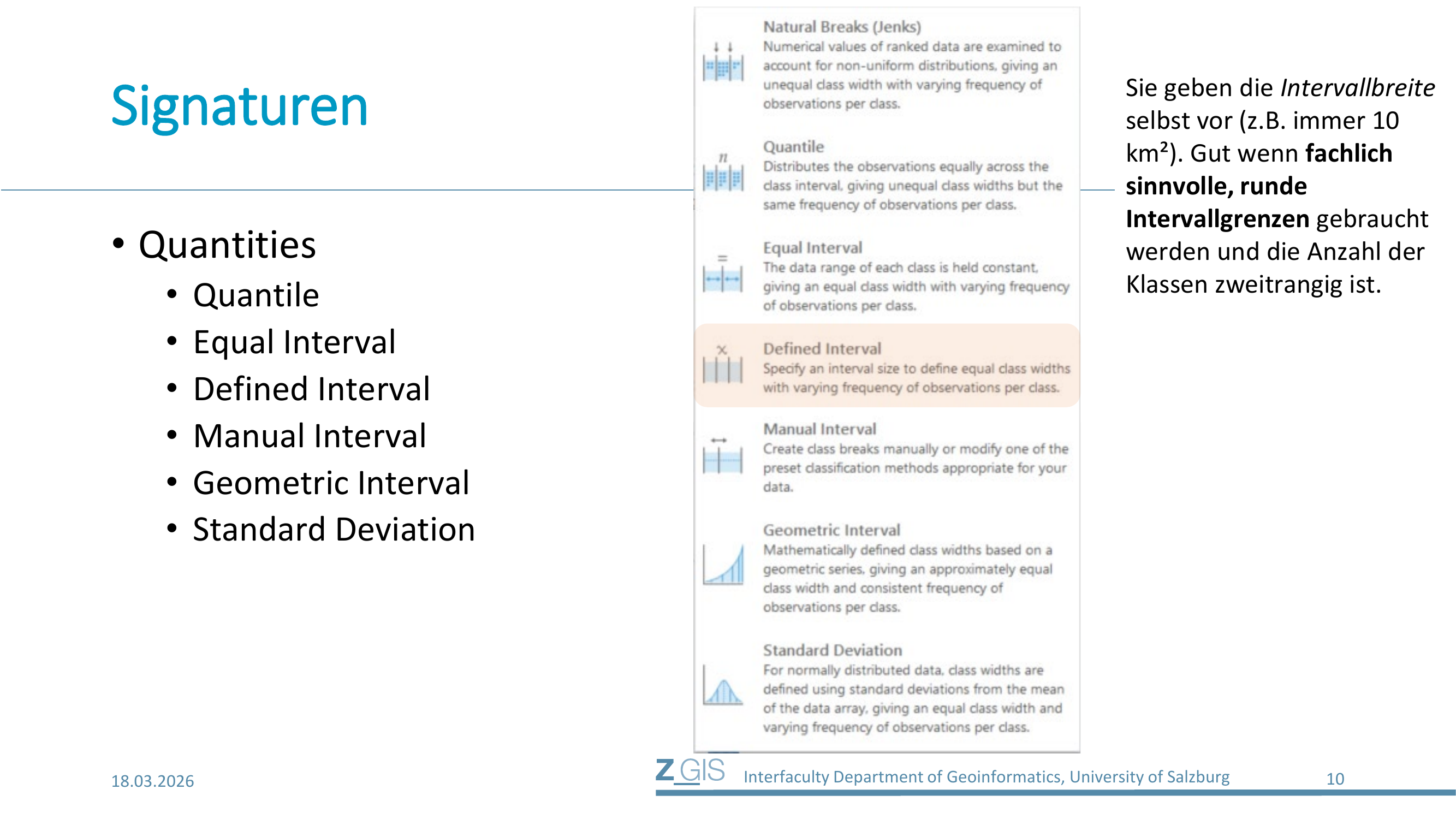 Bei Defined Interval gibt der Nutzer die Intervallbreite selbst vor. Man entscheidet z.B., dass jede Klasse genau 10 km2 breit sein soll, oder genau 1000 Einwohner umfassen soll. Die Anzahl der entstehenden Klassen ergibt sich dann automatisch aus dem Wertebereich der Daten geteilt durch die vorgegebene Intervallbreite.