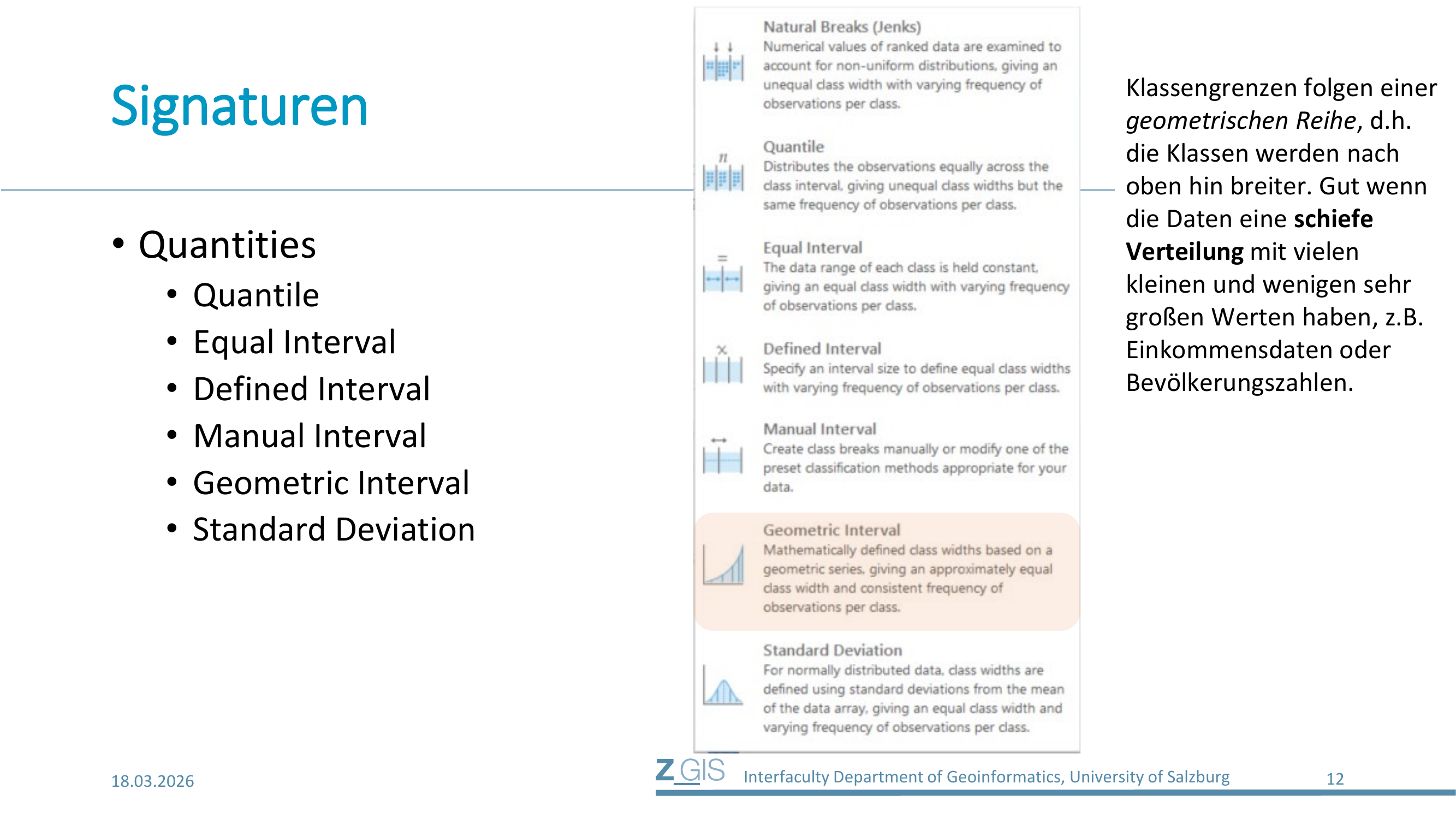 | Geometric Interval | geometrisch steigend | annähernd gleich | rechtsschief | Einkommen, Bevölkerung |
