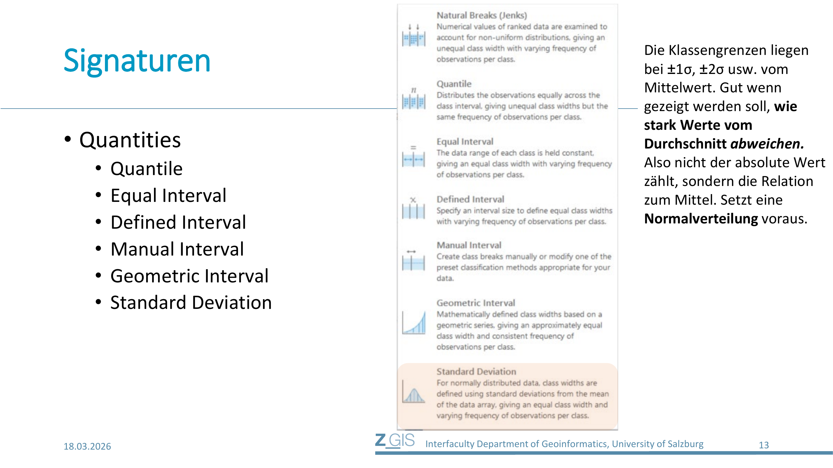 Die Methode setzt eine Normalverteilung der Daten voraus. Nur dann verteilen sich die Objekte symmetrisch um den Mittelwert, und die Klassen enthalten sinnvolle Anteile der Daten. Bei stark schiefen Verteilungen ist Standard Deviation ungeeignet, weil dann fast alle Werte in einer oder zwei Klassen liegen und die Karte kaum Variation zeigt.