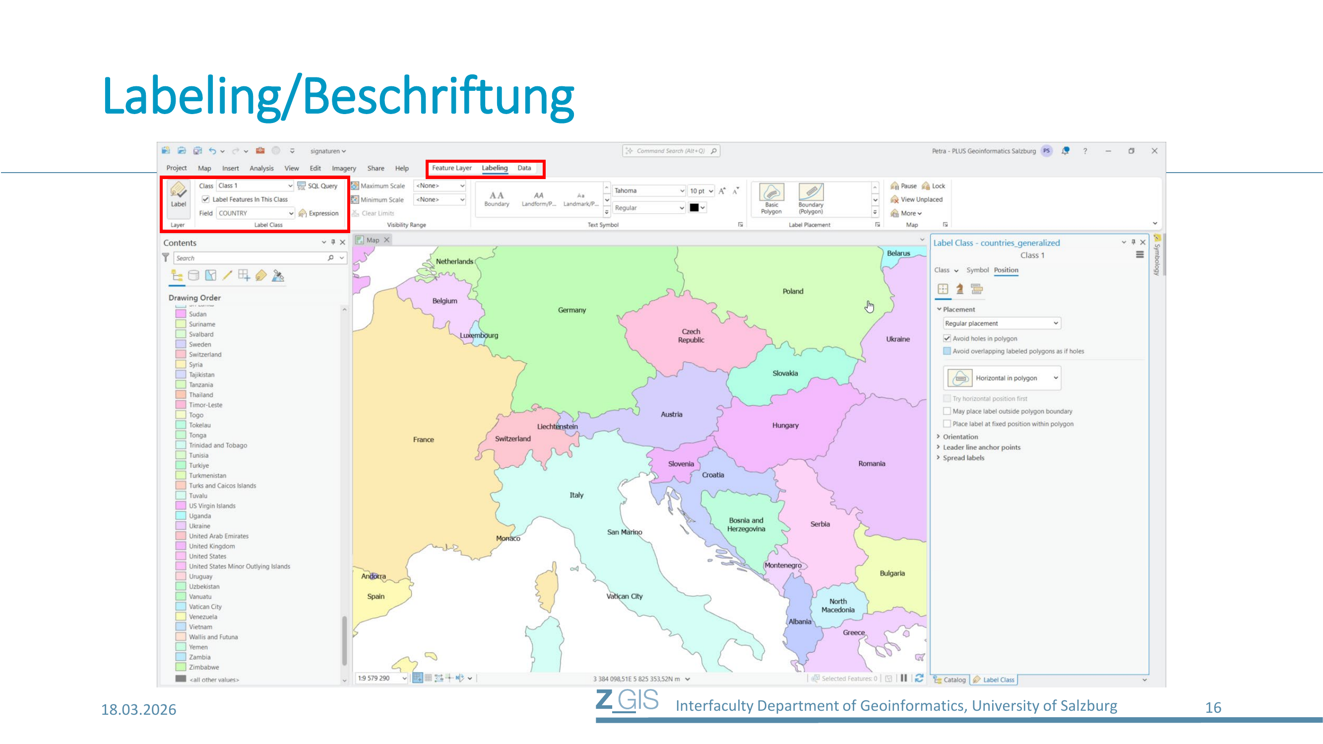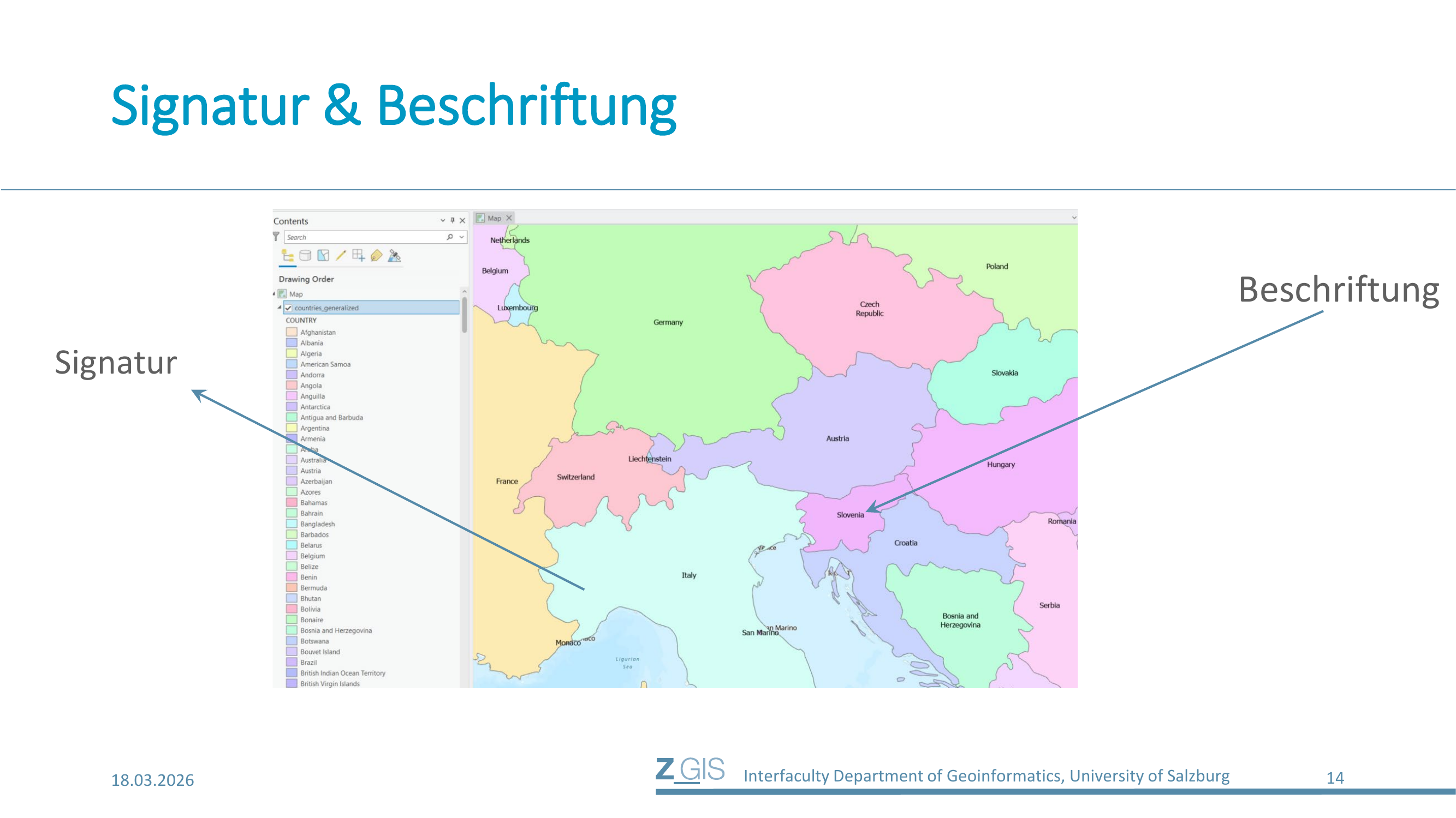 Neben der Signatur gibt es ein zweites wichtiges Gestaltungselement auf der Karte: die Beschriftung (Labeling). Während Signaturen Features visuell codieren, identifizieren Beschriftungen Features durch Text. Auf Slide 14 sieht man den Unterschied deutlich: Links im Contents-Panel die Signatur (die farbigen Symbole für jedes Land), rechts auf der Karte die Beschriftung (die Ländernamen wie "Germany", "Austria", "France").
