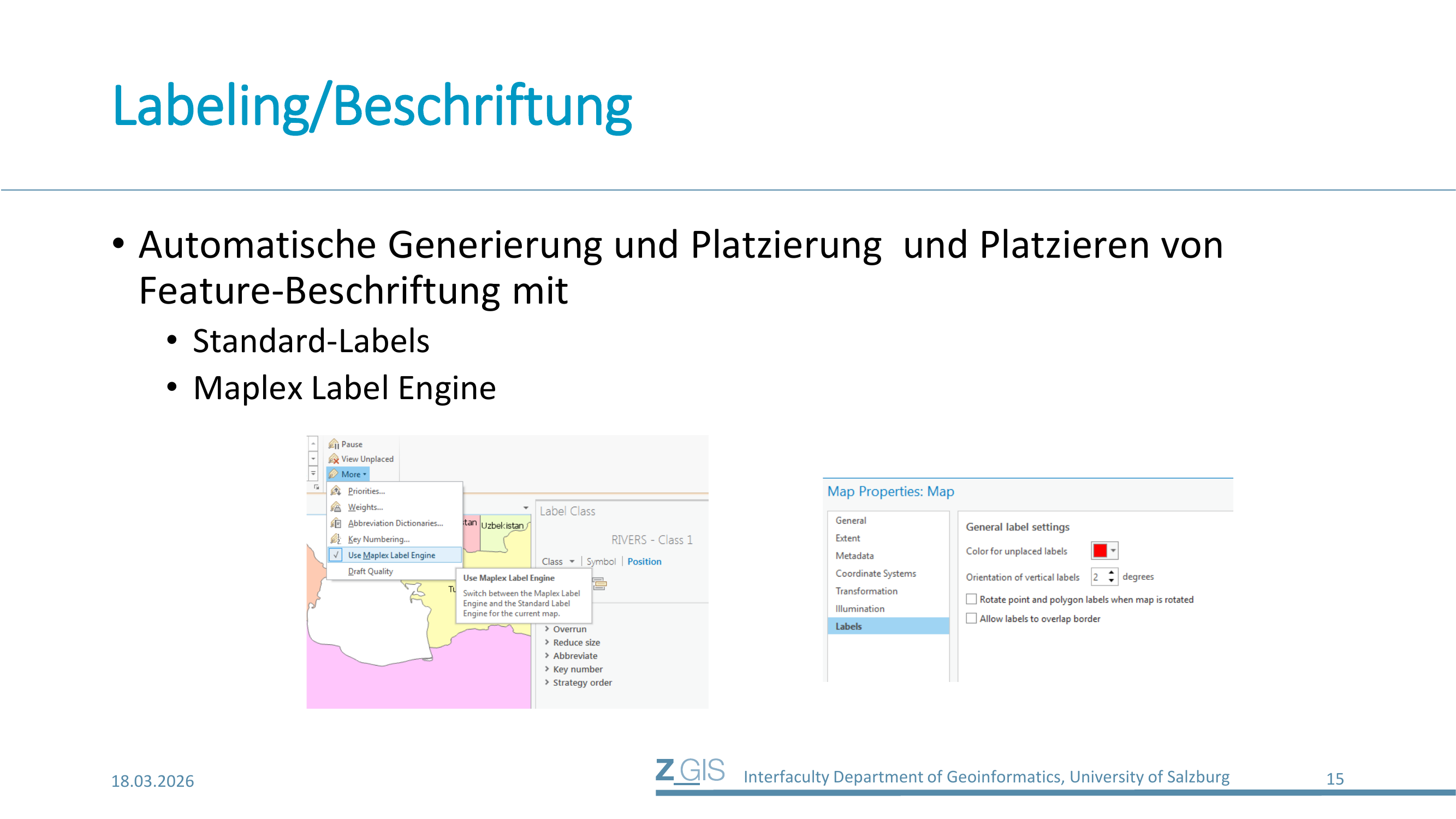 In ArcGIS Pro werden Beschriftungen automatisch generiert und platziert. Dafür stehen zwei Engines zur Verfügung: die Standard-Labels und die Maplex Label Engine. Die Maplex Label Engine bietet erweiterte Platzierungsstrategien und ist über das Menü "More" im Labeling-Tab aktivierbar. Sie kann Labels überlagern lassen (Overrun), verkleinern (Reduce Size), abkürzen (Abbreviate), Schlüsselzahlen vergeben (Key Number) und Platzierungsstrategien priorisieren (Strategy Order). In den Map Properties unter "Labels" können allgemeine Einstellungen vorgenommen werden, z.B. die Farbe für nicht platzierte Labels (die also keinen Platz gefunden haben) oder die Orientierung vertikaler Labels.