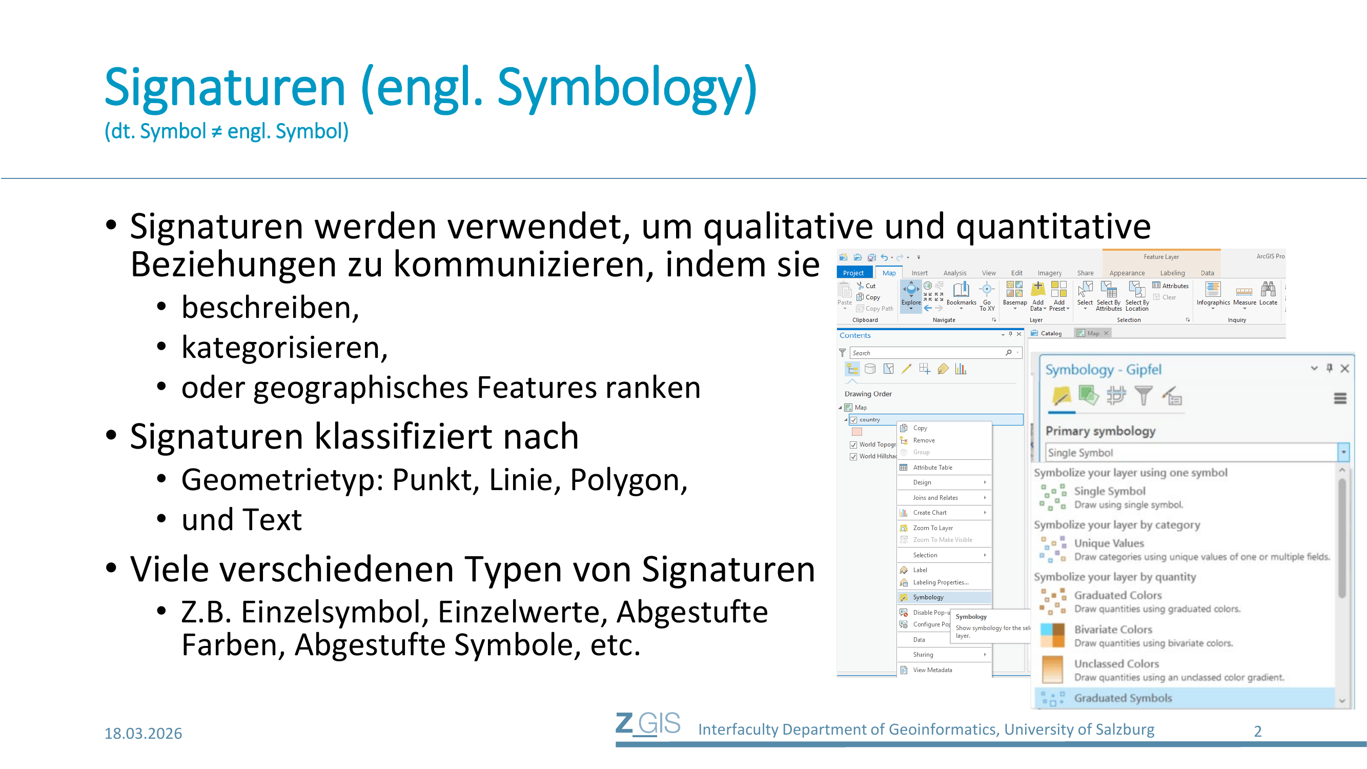 Wichtig ist die sprachliche Unterscheidung: Im Deutschen wird oft von "Symbol" gesprochen, doch der englische Fachbegriff lautet Symbology für das Gesamtkonzept der Signaturierung. Das deutsche Wort "Symbol" und das englische "Symbol" sind dabei nicht deckungsgleich. Im GIS-Kontext meint Symbology das gesamte System, mit dem Features auf der Karte dargestellt werden, während ein einzelnes Symbol nur ein konkretes grafisches Zeichen ist. In ArcGIS Pro findet man die Signaturierung über Rechtsklick auf einen Layer und dann den Menüpunkt "Symbology". Dort stehen verschiedene Darstellungsarten zur Auswahl: Single Symbol (ein einziges Symbol für alle Features), Unique Values (Kategorisierung nach Attributwerten), Graduated Colors (abgestufte Farben für quantitative Daten), Bivariate Colors, Unclassed Colors und Graduated Symbols.