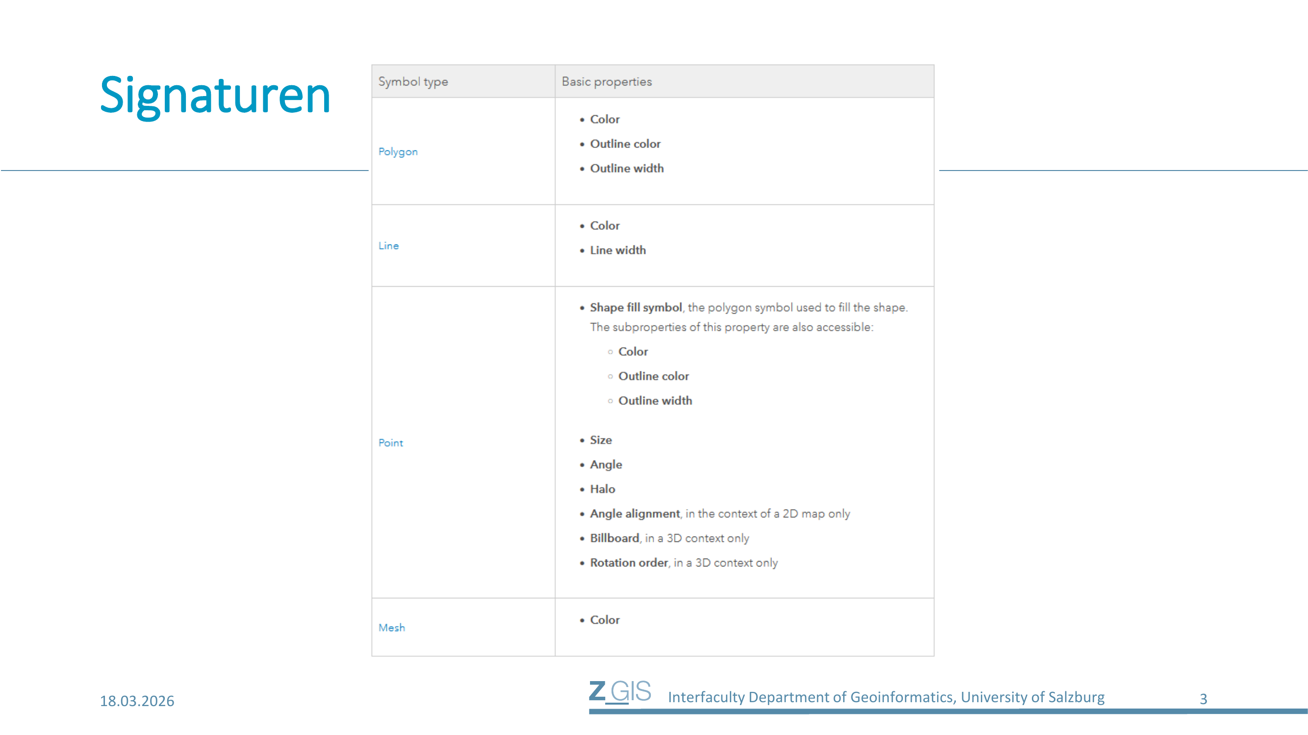 Jeder Geometrietyp hat seine eigenen Signatureigenschaften. Bei Polygon-Features kann man die Füllfarbe (Color), die Umrissfarbe (Outline Color) und die Umrissstärke (Outline Width) anpassen. Linien-Features haben die Eigenschaften Farbe (Color) und Linienstärke (Line Width). Punkt-Features bieten die meisten Einstellungsmöglichkeiten: Neben dem Shape Fill Symbol mit Füllfarbe, Umrissfarbe und Umrissstärke können auch Größe (Size), Winkel (Angle), Halo, Winkelausrichtung (Angle Alignment, nur im 2D-Kontext), Billboard (nur im 3D-Kontext) und Rotationsreihenfolge (Rotation Order, nur im 3D-Kontext) eingestellt werden. Zusätzlich gibt es den Geometrietyp Mesh, der nur die Eigenschaft Farbe besitzt und für 3D-Oberflächen verwendet wird.