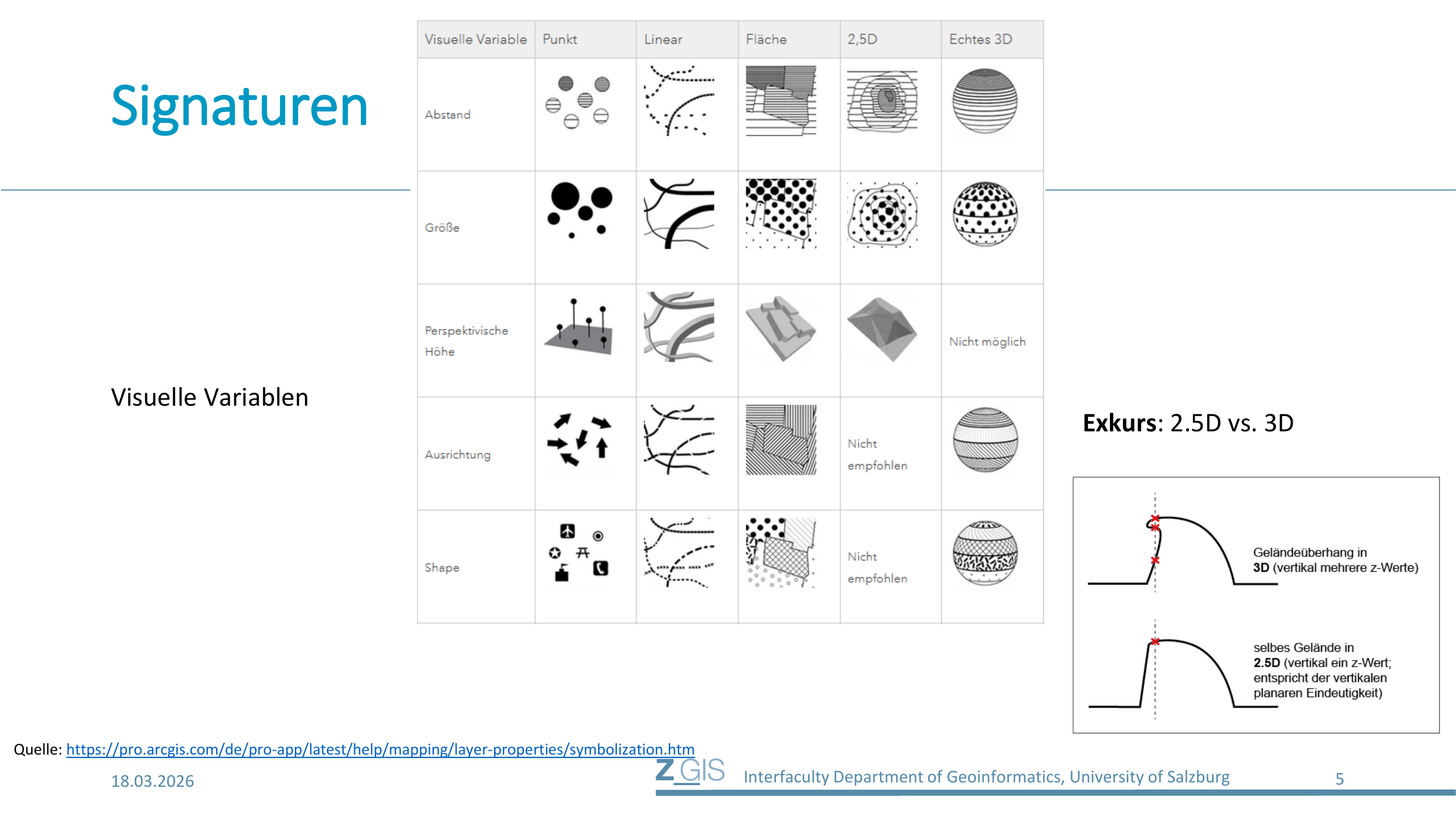 An dieser Stelle ist ein wichtiger Exkurs zu 2.5D vs. 3D nötig, weil dieser Unterschied in der Praxis und in Prüfungen relevant ist. Ein 2.5D-Modell hat die Eigenschaft der planaren Eindeutigkeit: An jedem Punkt (x, y) gibt es genau einen z-Wert. Das bedeutet, dass Geländeüberhänge nicht dargestellt werden können, denn an einem Geländeüberhang gäbe es für dieselbe (x, y)-Position mehrere Höhenwerte übereinander. Typische Digitale Geländemodelle (DGM) sind 2.5D. Ein echtes 3D-Modell erlaubt dagegen mehrere z-Werte pro (x, y)-Position, kann also Überhänge, Höhlen oder Brücken darstellen. Auf Slide 5 ist rechts eine Grafik, die diesen Unterschied veranschaulicht: Oben sieht man einen Geländeüberhang in 3D mit vertikal mehreren z-Werten, unten dasselbe Gelände in 2.5D, wo der Überhang "plattgedrückt" wird und nur ein z-Wert pro Position erlaubt ist.