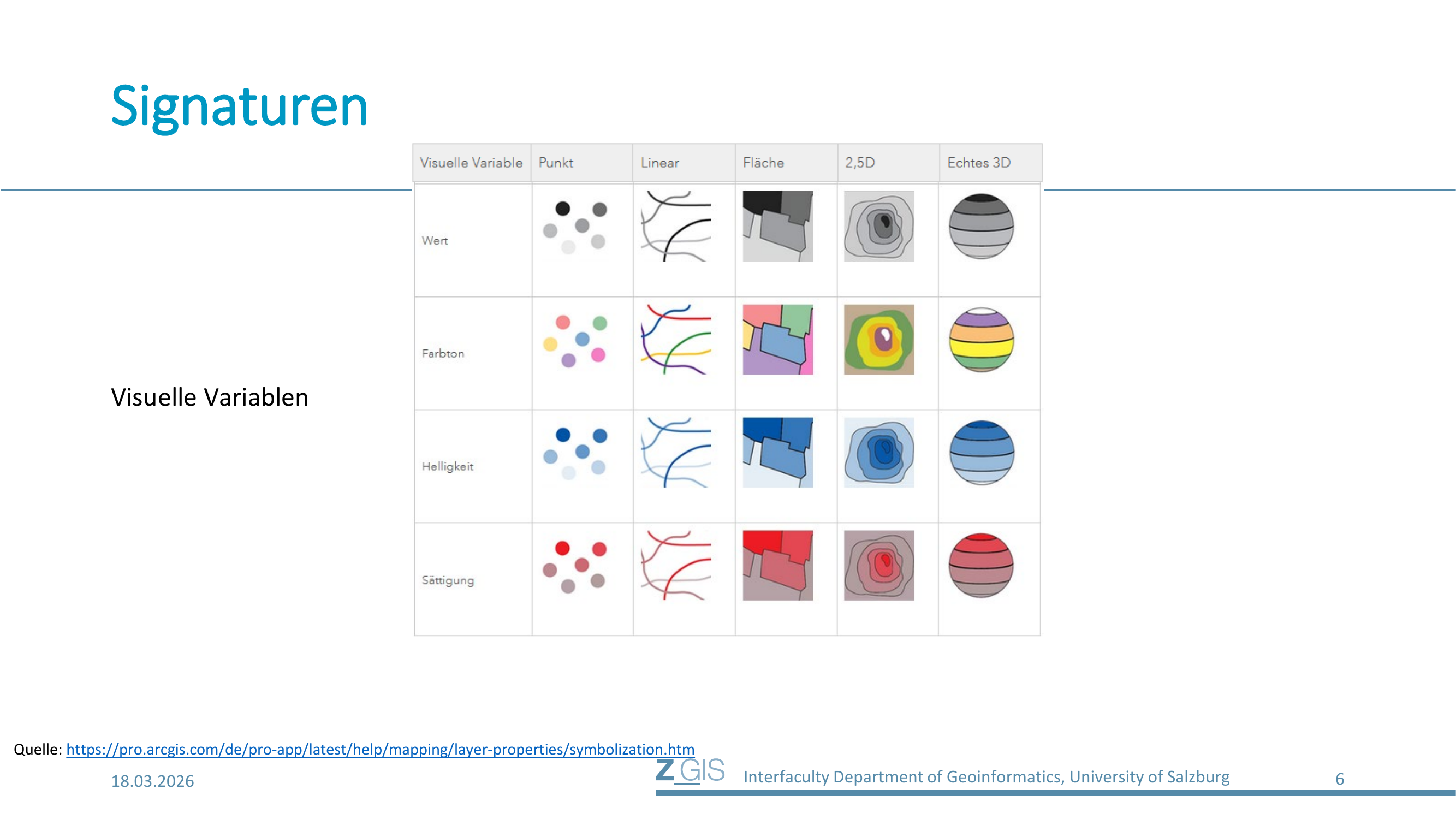 Die Frage, wie genau man Signaturen gestaltet, führt zum Konzept der visuellen Variablen (Visual Variables). Jacques Bertin hat in den 1960er Jahren ein System von visuellen Variablen definiert, das bis heute die Grundlage der kartographischen Gestaltung bildet. In ArcGIS Pro werden neun visuelle Variablen unterschieden, die je nach Geometrietyp unterschiedlich einsetzbar sind.