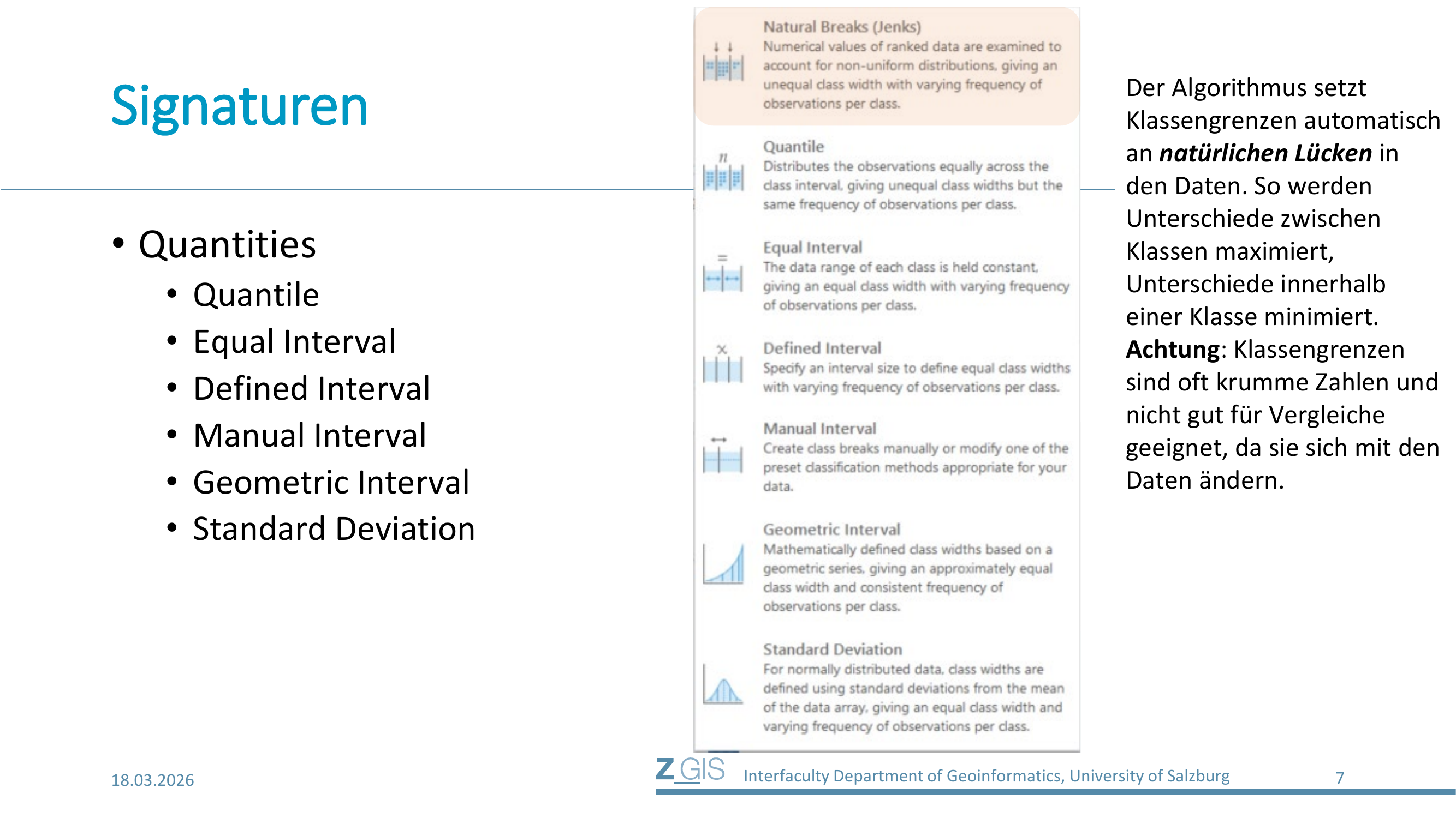 | Natural Breaks (Jenks) | ungleich | ungleich | beliebig, mit Lücken | explorative Analyse, Default |