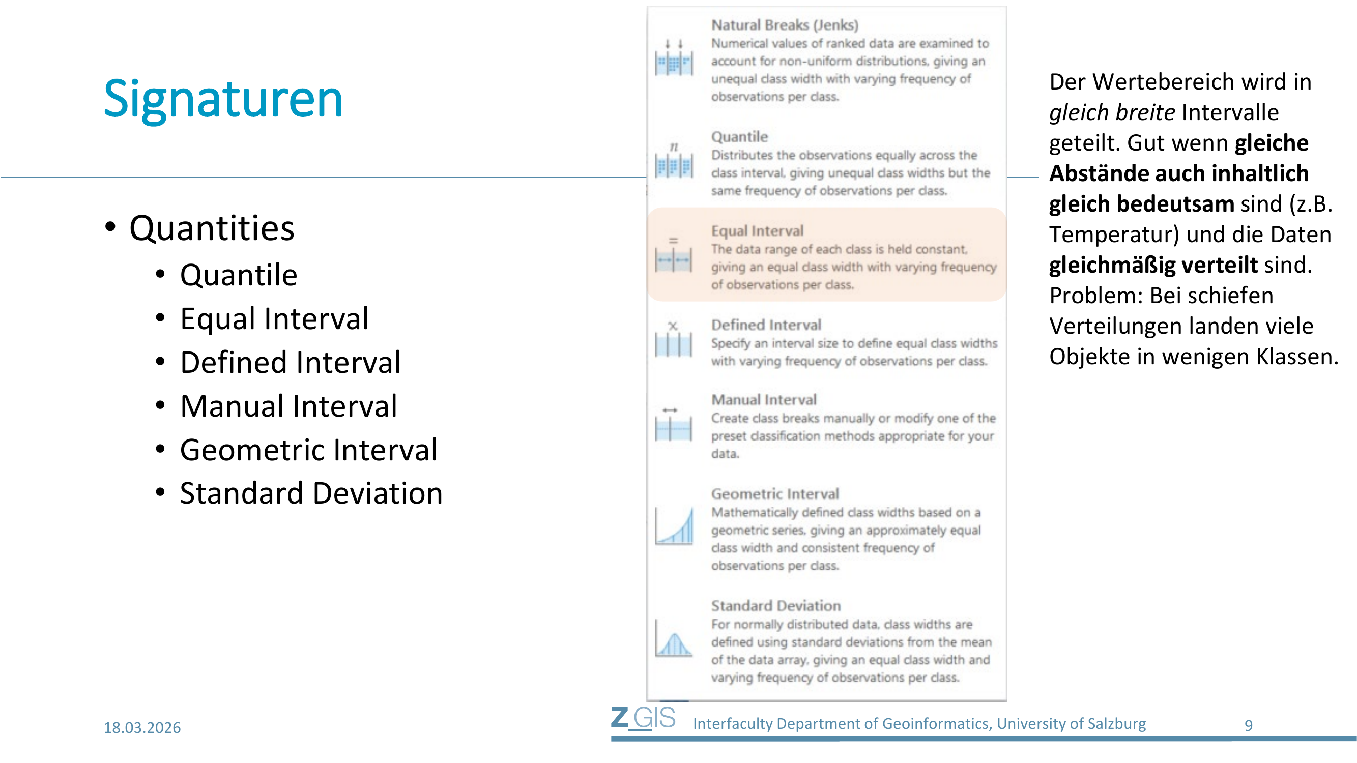 Der Nachteil: Man hat keine direkte Kontrolle über die Anzahl der Klassen. Bei einem großen Wertebereich und kleiner Intervallbreite können sehr viele Klassen entstehen, was die Legende unübersichtlich macht. Außerdem kann die Verteilung der Objekte auf die Klassen sehr ungleichmäßig sein.